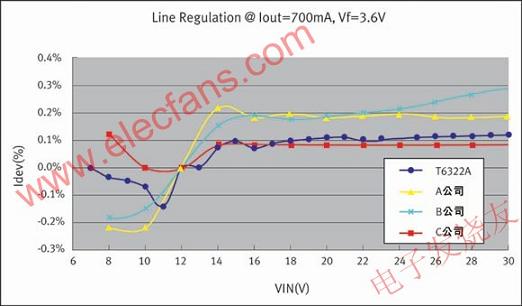 圖1對(duì)T6322與其它產(chǎn)品的功率轉(zhuǎn)換效率進(jìn)行了對(duì)比。圖2是T6322與其他產(chǎn)品的線路調(diào)整能力的對(duì)比(低電流變動(dòng)率即表示高線路調(diào)整能力)。