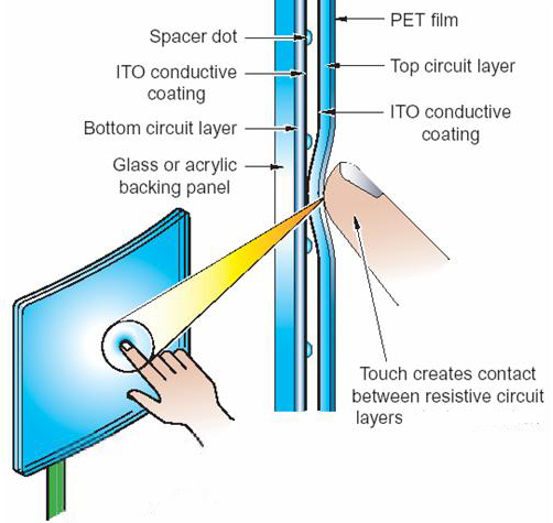 電阻式:從目前的推廣應(yīng)用來看,電阻式觸摸屏是占主導(dǎo)地位的觸摸技術(shù)。它由玻璃面板,銥錫氧化物(ITO)電阻涂層組成,并帶有導(dǎo)電涂層的護(hù)板,沿著邊緣有銀色的總線條。兩個(gè)層之間用絕緣小點(diǎn)隔開。觸摸屏幕時(shí),護(hù)板彎曲與玻璃上的涂膜相接觸(圖1)。