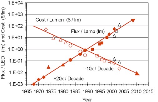 上述的講法聽來有些讓人疑惑,今日不是一直強(qiáng)調(diào)LED的亮度突破嗎?2003年LumiledsLighting公司RolandHaitz先生依據(jù)過去的觀察所理出的一個經(jīng)驗(yàn)性技術(shù)推論定律,從1965年第一個商業(yè)化的LED開始算,在這30多年的發(fā)展中,LED約每18個月;24個月可提升一倍的亮度,而在往后的10年內(nèi),預(yù)計(jì)亮度可以再提升20倍,而成本將降至現(xiàn)有的1/10,此也是近年來開始盛行的Haitz定律,且被認(rèn)為是LED界的Moore(摩爾)定律。