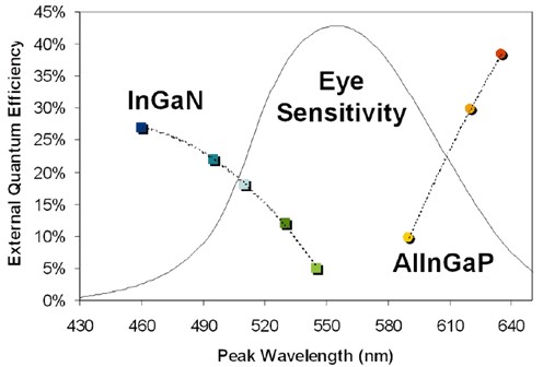 圖中為InGaN與AlInGaP兩種LED用的半導(dǎo)體材料,在各尖峰波長(光色)下的外部量子化效率圖,雖然最理想下可逼近40%,但若再將光取效率列入考慮,實(shí)際上都在15%;25%間,何況兩種材料在更高效率的部分都不在人眼感受性的范疇內(nèi),范疇之下的僅有20%。
