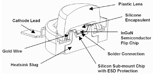 從Lumileds公司Luxeon系列LED的橫切面可以得知,硅封膠固定住LED裸晶與裸晶上的熒光質(zhì)(若有用上熒光質(zhì)的話),然后封膠之上才有透鏡,而裸晶下方用焊接(或?qū)岣啵┡c硅子鑲嵌芯片(SiliconSub-mountChip)連接,此芯片也可強(qiáng)化ESD靜電防護(hù)性,往下再連接散熱塊,部分LED也直接裸晶底部與散熱塊相連。