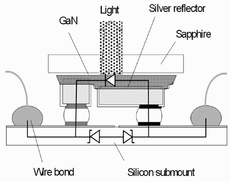 Lumileds公司Luxeon系列LED的裸晶實(shí)行覆晶鑲嵌法,因此其藍(lán)寶石基板變成在上端,同時還加入一層銀質(zhì)作為光反射層,進(jìn)而增加光取出量,此外也在SiliconSubmount內(nèi)制出兩個基納二極管(ZenerDiode),使LED獲得穩(wěn)壓效果,使運(yùn)作表現(xiàn)更穩(wěn)定。