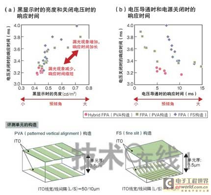 Hybrid FPA試制單元,其電壓關閉時的液晶分子響應時間和黑顯示時的亮度與已有FPA的試制單元相比,均得到了改善(a)。而電源導通時的響應速度稍慢于FPA(b)。(圖根據索尼的資料制作)[page]