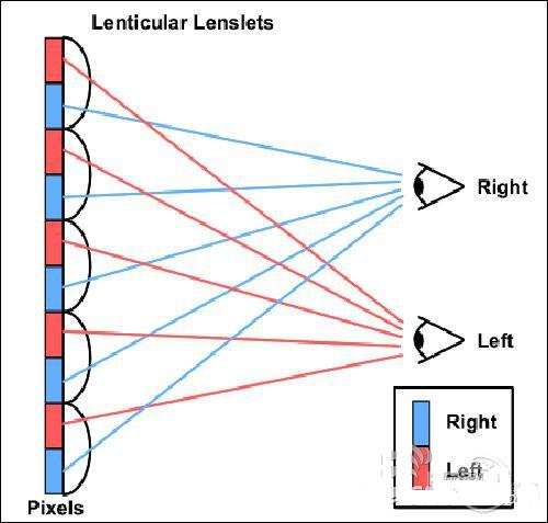 柱狀透鏡(LenticularLens)技術也被稱為雙凸透鏡或微柱透鏡3D技術,其最大的優勢便是其亮度不會受到影響。柱狀透鏡3D技術的原理是在液晶顯示屏的前面加上一層柱狀透鏡,使液晶屏的像平面位于透鏡的焦平面上,這樣在每個柱透鏡下面的圖像的像素被分成幾個子像素,這樣透鏡就能以不同的方向投影每個子像素。于是雙眼從不同的角度觀看顯示屏,就看到不同的子像素。不過像素間的間隙也會被放大,因此不能簡單地疊加子像素。讓柱透鏡與像素列不是平行的,而是成一定的角度。這樣就可以使每一組子像素重復投射視區,而不是只投射一組視差圖像。