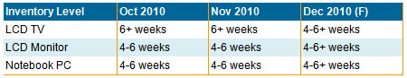 盡管11月份之前液晶顯示器庫存量處于中等水平,但主要液晶顯示品牌商重點投放的中國市場卻銷售緩慢,從而導致了2010年年底庫存量上升。