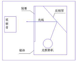 背投(RearProjector)的定義是相對于傳統(tǒng)的前投(FrontProjector)而言的。二者的主要區(qū)別在于圖像光線的來源方式。前投系統(tǒng)中,觀察者和投影機(jī)位于反射屏幕的同一側(cè),投影機(jī)投射出的光線照射到屏幕后,再經(jīng)過反射到達(dá)觀察者;而背投系統(tǒng)中,觀察者和投影機(jī)位于顯示屏幕的兩側(cè),從投影機(jī)發(fā)出的光線照射到半透明的顯示屏幕上,部分透過后形成圖像,所以觀察者看到的是透射出來的光,其原理如圖1: