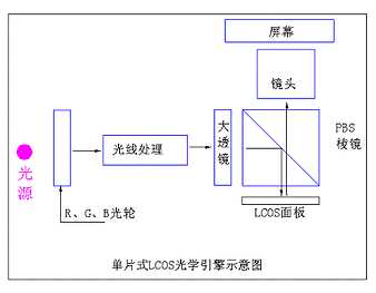 LCOS顯示面板其中一面以CMOS芯片為基板,無法讓光線直接穿過,因此采用穿透式成像方式,因此其背投光學(xué)系統(tǒng)和LCD背投影機(jī)便產(chǎn)生了區(qū)別。通常LCOS光學(xué)系統(tǒng)中需要利用偏極化分光鏡(PolarizationBeamSplitter:PBS),將入射LCOS面板的光線與反射的光線分開。PBS是由兩個45度等腰直角棱鏡底邊粘合的而成的棱鏡,當(dāng)非線性偏極化光入射PBS時,PBS會反射入射光的S偏振光(垂直入射線平面),并且讓P偏振光(平行入射線平面)通過。關(guān)于LCOS光學(xué)系統(tǒng)技術(shù)仍在起步階段,所以IBM、ColorQuad、Philip、Hologram等多家廠商都開發(fā)了不同的LCOS光學(xué)引擎架構(gòu)。但主要可分為單片式和三片式兩大類,如下: