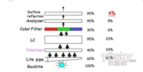 首先,這種方法省去了彩色濾色片,而濾色片是光能的主要吸收者,它會損失光能70%以上。下圖表明了光能從光源出發以后所受到的損失。