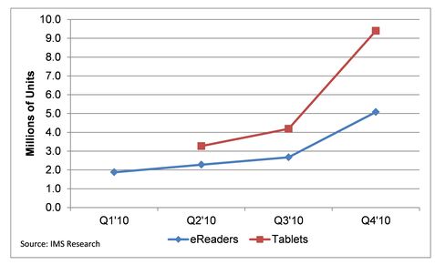 報(bào)告顯示,在2010年的假期中,平板電腦和電子書閱讀器的市場十分火爆。電子書閱讀器出貨量在2010年第四季度相比于第三季度增長了90%,而全年的增長量為116%,銷量達(dá)到了510萬臺(tái),其中亞馬遜的Kindle和Barnes & Noble公司的NOOK成為了最大贏家。