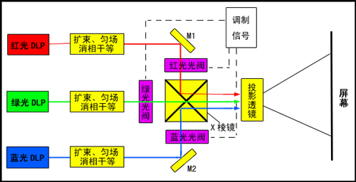 以投影方式為激光顯示解決方案的工作原理如圖1.1所示:紅、綠、藍(lán)三色激光分別經(jīng)過擴(kuò)束、勻場、消相干后入射到相對應(yīng)的光閥上,光閥上加有圖像調(diào)制信號,經(jīng)調(diào)制后的三色激光由X棱鏡合色后入射到投影物鏡,最后經(jīng)投影物鏡投射到屏幕,得到激光顯示圖像。