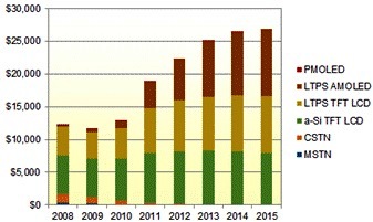 DisplaySearch報告亦顯示,2010年非晶硅(a-si) TFT LCD以61.5%市占率領先所有手機面板顯示技術,而低溫多晶硅(LTPS) TFT LCD 在智能手機應用市場更具競爭力,在2010年手機應用市場出貨達到3億1,600萬片,占19.5%比例。