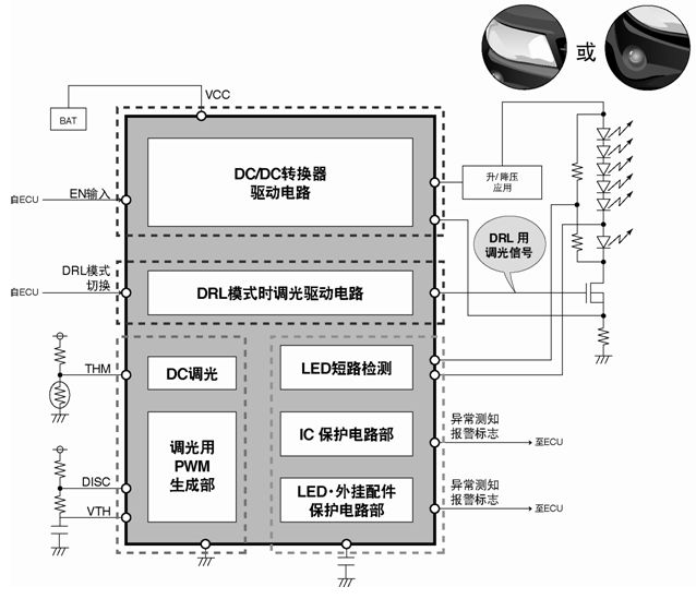 最近,汽車(chē)用前照燈正在逐漸推進(jìn)LED化,以高效、長(zhǎng)壽這一優(yōu)點(diǎn)為背景,未來(lái)有望成為前照燈市場(chǎng)的重心。此外為確保車(chē)輛安全、可見(jiàn)度,安裝使用LED前照燈的事例會(huì)不斷增加,而未來(lái)預(yù)計(jì)LED前照燈/DRL的搭載也將面向車(chē)載用途形成標(biāo)準(zhǔn)規(guī)格系列。目前,LED前照燈只限于高級(jí)豪華車(chē)等一部分的車(chē)型上選用,對(duì)汽車(chē)制造商、前照燈制造商來(lái)說(shuō),多采用延用通用的LED驅(qū)動(dòng)IC,或以分立元器件為主構(gòu)成的形式,如果裝載DRL就需要另外配備與其相配的驅(qū)動(dòng)電路。羅姆針對(duì)未來(lái)前照燈的LED化,率先著手開(kāi)發(fā)了一款專(zhuān)用的IC,并推動(dòng)獲得前照燈用LED驅(qū)動(dòng)器所需功能的專(zhuān)用IC的開(kāi)發(fā)。此次羅姆新開(kāi)發(fā)的這種前照燈專(zhuān)用LED驅(qū)動(dòng)IC,特別面向歐美等國(guó)先行開(kāi)始普及的DRL,通過(guò)內(nèi)置振蕩器電路實(shí)現(xiàn)微處理器控制的PWM調(diào)光。另外,為對(duì)應(yīng)要求高可靠性的車(chē)載市場(chǎng)需求,在搭載能監(jiān)測(cè)LED短路、LED開(kāi)路等前照燈故障的各種保護(hù)功能,與分裝器件構(gòu)成時(shí)或與通用的LED驅(qū)動(dòng)IC組成時(shí)的情況相比,通過(guò)削減部件數(shù)量從而實(shí)現(xiàn)了可靠性的大幅提高。另外,絕對(duì)最大電壓設(shè)定為50V,對(duì)于鋰離子電池電壓波動(dòng)也能非常輕松地承受的高耐壓化也得以實(shí)現(xiàn)。