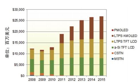 市場調研公司DisplySearch表示,因新興經濟市場繼續走俏,轉向智能手機趨勢增強,技術要求提高,包括加大顯示屏尺寸、改進分辨率等。預測2011年其顯示屏出貨量將迅速提升到18億片,增長12.5%,銷售額更將大幅增長47%,達到188億美元,2012年續增19%,達224億美元,預計2015年有望達到約270億美元,2010~2015年的年均增長率為16%,前景可觀(圖l)。