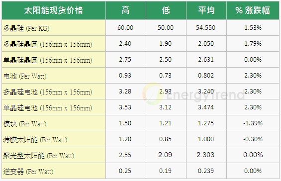 - 上游的多晶硅平均成交價來到$54.55/kg