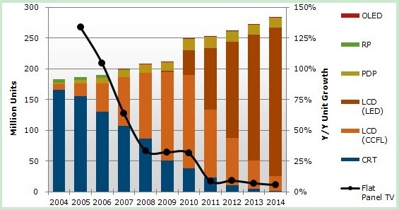 2004-2014年從技術(shù)類型預(yù)測(cè)全球電視出貨情況