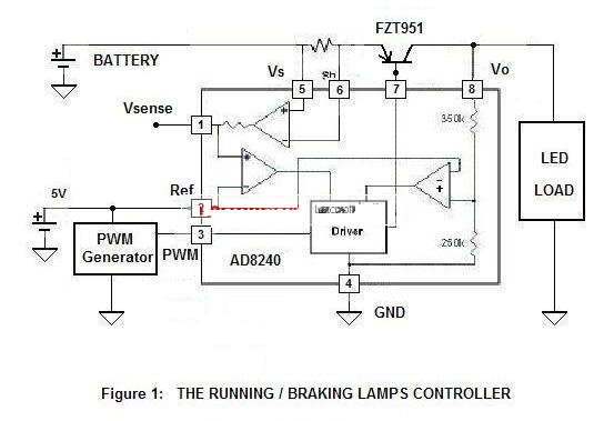 請(qǐng)注意,LED亮度隨著占空比提高而增大。踩下剎車時(shí),占空比為95%,LED陣列最亮。正常行駛期間,占空比為5%,LED陣列變暗。兩種工作狀態(tài)共用一個(gè)LED陣列可以降低成本。