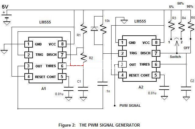 定時(shí)器A2將該信號(hào)轉(zhuǎn)換為脈沖寬度調(diào)制信號(hào),后者的占空比由R3、R4、R5和C2決定。脈沖寬度由下式?jīng)Q定:
