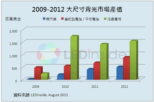 各家品牌廠商對于平板電腦的面板分辨率要求越來越高,因此2011年每臺平板電腦的LED使用數量約36~42顆不等,2012年甚至有機會進一步的倍增。雖然平板電腦2011年銷售數量有機會超過5億臺,然而絕大部分都是蘋果電腦的iPad、iPad 2所貢獻,而目前蘋果電腦的LED背光供應鍊主要由日系廠商所把持,因此臺灣產業鍊方面僅個別廠商受惠。