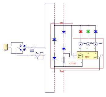 在此電路中,芯片供電利用壓差,電勢(shì)一級(jí)級(jí)的往下降,形成了梯式壓降,故而稱壓階傳輸。其實(shí),信號(hào)傳輸也利用了壓階傳輸?shù)姆绞?,芯片與芯片之間的信號(hào)線串接了壓階管,這樣做的目的是經(jīng)過每一級(jí)后,降低一階信號(hào)電勢(shì),使該級(jí)芯片的信號(hào)與地之間的電勢(shì)差保持正常工作的一個(gè)差值,否則,會(huì)因?yàn)橄鄬?duì)電勢(shì)過大而燒毀芯片。我們可以注意到這個(gè)電路只要兩條線,一條供電,一條信號(hào)傳輸,供電的線是串行的,所以總線上的電流比較小,用較細(xì)的線就行了。電路的末端,用了一個(gè)CYT1A50,它可以使整個(gè)線路恒流。另一方面,由于它的端口耐壓也比較高,可以將電路上多余的壓降壓在這顆芯片上。