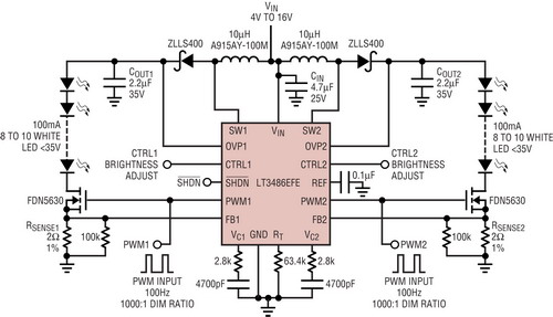 就夜間觀看極亮的顯示器而言,LT3486以其獨特的內部PWM調光架構提供1000:1的PWM調光比。內部LED電流存儲器具有超快PWM響應時間,可以低于10us的時間讓LED電流從零返回到100mA,以實現真彩PWM調光。在高端顯示器中用兩個LT3486驅動分別代表紅、綠、綠、藍(R-G-G-B)的4個LED串,可實現1000:1的調光比,并在非常暗的夜間工作環境保持顯示器的真彩特性。