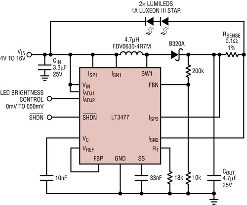 圖3所示的LT3477降壓-升壓型LED驅動器以1A電流驅動兩個大功率LED。這兩個LED無需以地為基準,連接的兩個端子一般是轉換器的輸出和電池輸入。LT3477有兩個獨特和具100mV浮動電流檢測輸入引腳,這引腳連接與LED串串聯而且不以地為基準的電流檢測電阻。在汽車電池的工作電壓范圍內以及低于這個范圍時,在電流直到1A的情況下都可實現準確的LED穩流。LT3477的停機引腳用于實現車燈的接通/斷開功能,并在未使用時將輸入電流降低到1uA(典型值為100nA)。IADJ引腳用來為后部信號指示燈或剎車燈等剎車燈和尾燈應用實現高于10:1的模擬調光比。這類應用無需真彩PWM調光。