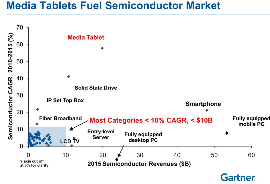 Gartner研究總監王端分析,今年PC半導體的營收減少了82億美元,但在智能型手機應用成長62億美元、功能手機應用跌20億美元和平板裝置半導體營收成長40億美元,幾乎回補了在PC部門下跌的幅度,所以去年跟今年幾乎持平。