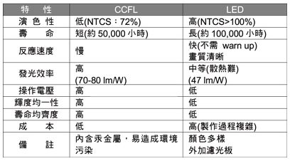 LED因耗電低、不含汞、壽命長、體積小、降低二氧化碳排放量等優(yōu)勢吸引國內、外廠商極力推廣取代現(xiàn)有照明。 LED主要照明可分為顯示背光、車用照明、交通號志與室內室外照明,而背光模組于2009年被廣泛的應用于筆記型電腦面板上,此后亦逐漸被使用到家用電視機,其約占了50%之面板模組零組件制造成本與消耗約70%顯示器之電能,故背光照明為顯示面板最重要的關鍵。 然液晶顯示器無法自行發(fā)光,因此需要背光模組作為光線的來源,所以背光源的好壞會影響顯示的效果甚劇。 加上面板需薄型化的因素,因此多以CCFL燈管作為背光源,而LED背光源比起CCFL有演色性佳、壽命長、反應速度快等優(yōu)勢(如表1)。