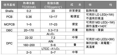 以下將LED散熱封裝材料之比較列于表3,早期LED以炮彈型方式進行封裝,其散熱路徑中有一小部分熱源經保護層往大氣方向散熱,大多熱源僅能透過金屬架往基板散熱,此封裝熱阻相當?shù)卮螅_250~350℃/W。 進而由表面貼合方式(SMD)于PCB基板上封裝,主要是藉由與基板貼合一起的FR4載板來導熱,利用增加散熱面積的方式來大幅降低其熱阻值。 但此低成本的封裝要面臨的問題是,F(xiàn)R4本身熱傳導系數(shù)較低,膨脹系數(shù)過高,且為不耐高溫的材料,在高功率的LED封裝材料上不太適用。