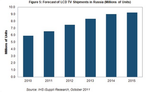 據IHS iSuppli公司的電視研究報告,隨著青睞先進電視技術的中產階級不斷壯大,今年俄羅斯液晶電視出貨量預計強勁增長10%。俄羅斯屬于所謂的金磚國家(BRIC),是一個重要市場。