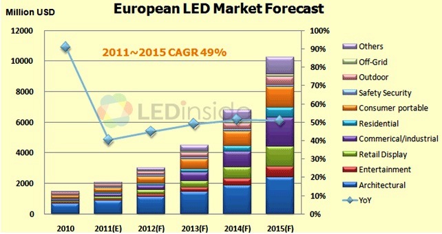 根據LEDinside調查, 2011年歐洲 LED照明市場約達20億美元以上,大約占全球 LED照明市場28%。盡管歐洲市場因為歐債而在 2011年有受到影響,但歐盟已經積極解決,也反應在市場上,隨著LED規格不斷的提升及大幅度降價等影響,LEDinside預估歐洲 LED照明市場每年都將會有大幅度成長,2015年歐洲 LED照明市場將會突破100億美元規模。