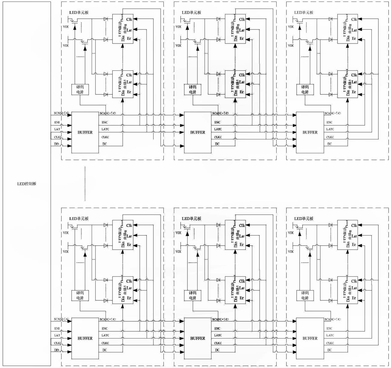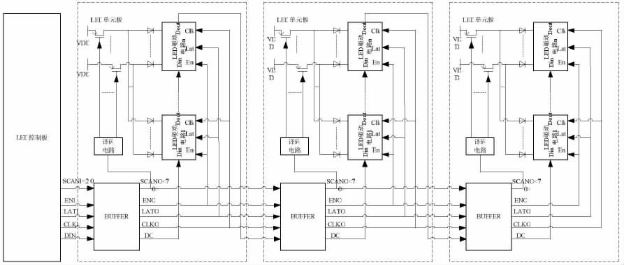 LED 控制板與LED 單元板構(gòu)成的LED 顯示系統(tǒng)的主體,如圖1 所示。其中,LED 單元板包括了增強(qiáng)信號驅(qū)動能力的BUFFER 電路、產(chǎn)生動態(tài)顯示掃描時(shí)序的譯碼電路、若干個(gè)開關(guān)管和若干個(gè)LED 驅(qū)動電路。其通信過程為:LED 控制板發(fā)出的通信信號依次經(jīng)過各串接的LED 單元板的BUFFER 電路進(jìn)行驅(qū)動增強(qiáng);各LED 單元板中經(jīng)BUFFER 電路增強(qiáng)后的掃描信號(SCANO)提供給本LED 單元板的譯碼電路,譯碼電路譯碼產(chǎn)生動態(tài)顯示掃描時(shí)序控制開關(guān)管;各LED 單元板中經(jīng)BUFFER 電路增強(qiáng)后的使能信號(ENO)、鎖存信號(LATO)、時(shí)鐘信號(CLKO)分別提供給本LED 單元板中所有LED 驅(qū)動電路。