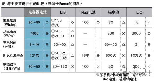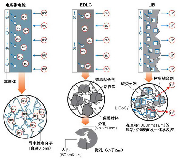 LIB的電子隨著正極中鋰金屬氧化物的化學反應而移動,因此充放電需要一定時間。而電容器電池或LIC是隨著離子的移動來交換電子的,因此反應很快。因而可實現幾分鐘~10分鐘左右的高速充放電。