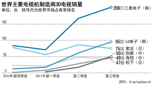 據(jù)市場調(diào)查機構Display Search 20日公布的《第三季度世界3D電視銷量》顯示,中國有4家企業(yè)進入前十,分別是創(chuàng)維(50萬臺,第4位)、海信(49萬臺,第5位)、長虹(34萬臺,第7位)、康佳(27萬臺,第9位)。