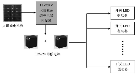 太陽能LED 路燈的結構如圖1 所示。太陽能電池板在太陽光的照射下,其內部PN 結會形成新的電子空穴對,在一個回路里就能產生直流電流,這個電流流入控制器,會以某種方式給蓄電池充電。蓄電池在白天的時候會接受充電,而在晚上則會提供能量給LED.