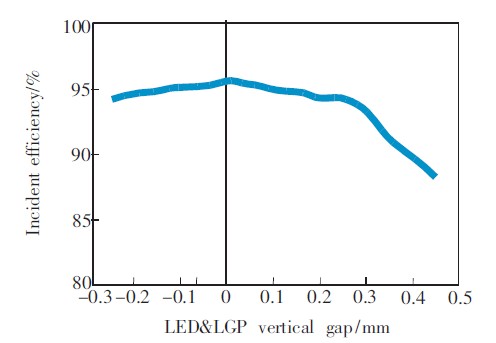 LED發(fā)光面和LGP入光面兩者之間的垂直距離通常會(huì)被忽略,但如果兩者之間的距離過(guò)大,也會(huì)嚴(yán)重影響入射效率。通過(guò)試驗(yàn)發(fā)現(xiàn),兩者之間的距離在±0.2mm范圍內(nèi)時(shí),入射效率變化緩慢,且保持在95%左右,所以控制LED發(fā)光面和LGP入光面的垂直距離在±0.2mm范圍內(nèi)即可。