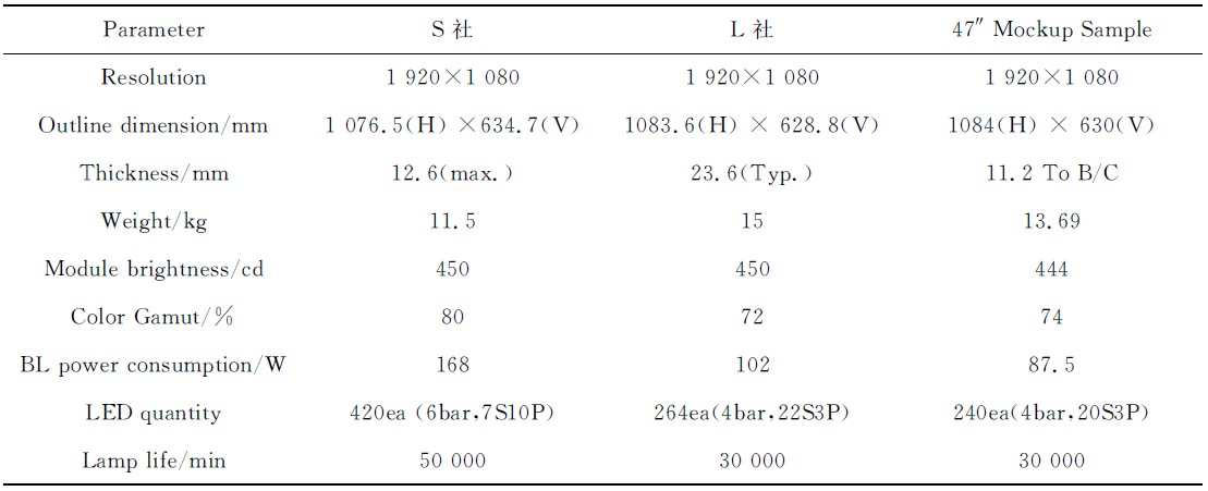 本文中設(shè)計(jì)的樣品在保證了光學(xué)性能的前提下,實(shí)現(xiàn)了低功耗的目標(biāo),達(dá)到了《平板電視能效限定值及能效等級(jí)》中規(guī)定的一級(jí)能耗,產(chǎn)品的厚度和色域也具有一定的優(yōu)勢(shì)。