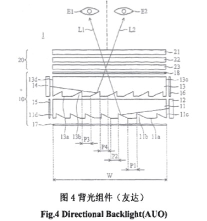 友達、奇美也分別開發了利用特殊的背光實現全分辨率立體顯示的技術,基本原理與3M的指向件背光技術類似,都是利用單獨驅動的兩組光源將光線分別投射到左右區域:圖4是友達的相關技術的示意圖。