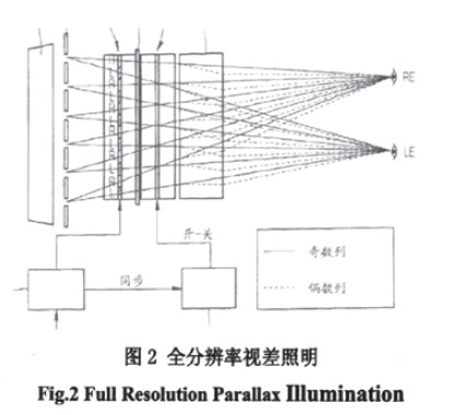 圖2是視差照明技術結合雙折射扳分光的示意圖。通過控制偏振選擇開關(例如TN盒),可以調整通過取折射板的光的偏振方向,從而控制成像的位置。通過精確的光學設計,使得兩種偏振狀態下成像位置互補,結合時序圖像驅動達到全分辨率立體顯示的效果。