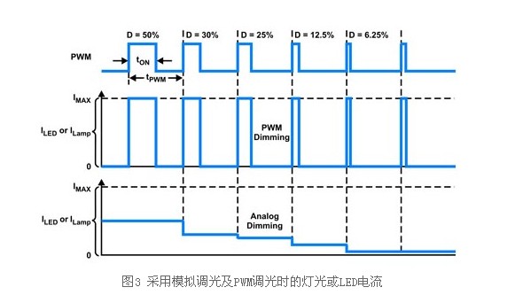 為提升顯示效果,并優化不同環境照明亮度的LED驅動器效率,較新型LED背光電子裝置能達到較大的調光范圍。有兩種方法可用于LED調光:脈沖寬度調變(PWM)調光及模擬調光(圖3)。