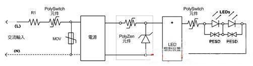 驅動輸出上的PolySwitch組件有助于防止因有害短路或其他負載異常而受損,為了充分發揮PolySwitch組件的作用,可以與金屬芯電路板或LED散熱片熱接,此外,與LED并置的PESD組件也可以對靜電放電加以保護。