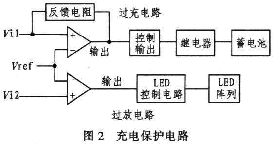 充電保護(hù)電路由兩個(gè)運(yùn)算放大器組成,電路如圖2所示。圖2中Vi1、Vi2分別為蓄電池的輸出電壓,Vref為運(yùn)算放大器的比較參考電壓,其具體值根據(jù)不同的要求由用戶設(shè)定。在實(shí)際設(shè)計(jì)過程中,要注意圖2中反饋電阻的選取,反饋電阻越大,控制輸出所對(duì)應(yīng)的輸入Vi回差值越小。
