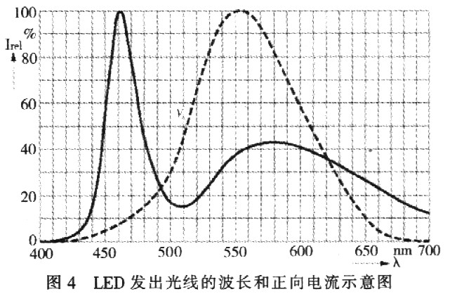 白光LED設(shè)計(jì)中采用了一個(gè)小竅門。在發(fā)射藍(lán)光的InGaN基料上覆蓋轉(zhuǎn)換材料,這種材料在受到藍(lán)光激勵(lì)時(shí)會(huì)發(fā)出黃光。于是得到了藍(lán)光和黃光的混合物,在肉眼看來就是白色的,圖4為LED發(fā)出光線的波長和正向電流示意圖。由圖4可以看出:白光LED的發(fā)射波長(實(shí)線)包括藍(lán)光和黃光區(qū)域的峰值,但是在肉眼看來就是白色。肉眼的相對(duì)光敏感性(虛線)如圖4所示。