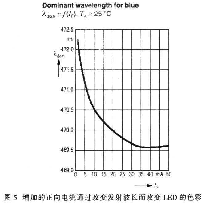 但是,采用InGaN技術(shù)的LED并不像標(biāo)準(zhǔn)綠光、紅光和黃光那樣容易控制。InGaN LED的顯示波長(色彩)會(huì)隨著正向電流而改變(如圖5所示)。例如,白光LED所呈現(xiàn)的色彩變化產(chǎn)生于轉(zhuǎn)換材料的不同濃度,且藍(lán)光發(fā)光InGaN材料隨著正向電壓的變化而產(chǎn)生波長變化。