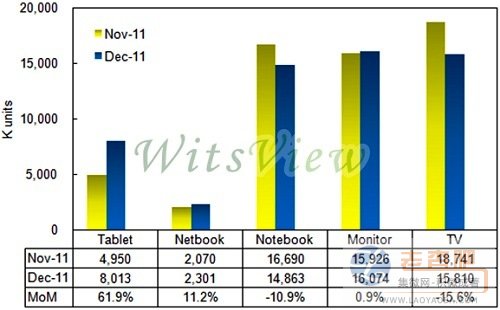 監(jiān)視器面板出貨量為1,607萬(wàn)片,月增0.9%;筆記型電腦面板出貨量為1,486萬(wàn)片,月減10.9%。平板電腦方面,WitsView指出,蘋果(Apple)新一代 iPad 3 面板,持續(xù)受到生產(chǎn)良率問(wèn)題,造成目前供貨量依然受到限制,但華南地區(qū)對(duì)于山寨平板電腦需求,依舊強(qiáng)勁,整體平板電腦面板出貨較11月增加61.9%,出貨量來(lái)到801萬(wàn)片。小筆電用面板出貨量則來(lái)到230萬(wàn)片,較上月增加11.2%。