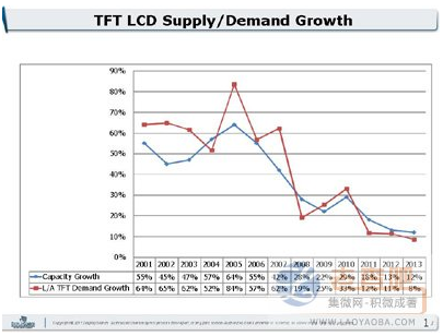 首先是面板的供需關(guān)系已經(jīng)質(zhì)變。過去10年是產(chǎn)能與需求均快速成長的時期(圖1)。在產(chǎn)業(yè)處于快速發(fā)展期時,當(dāng)供給成長速度快于需求,便會產(chǎn)生供過于求,反之亦然。然自2011年開始,供給與需求皆不會再如過去般劇烈變化,產(chǎn)業(yè)已由青年時期步入成年期。相對地,許多策略如產(chǎn)能利用、技術(shù)開發(fā)、市場開拓、財務(wù)運作與客戶關(guān)系等已演化出成熟期的作法,此將體現(xiàn)在2012年面板廠商及其供應(yīng)鏈的眾多策略調(diào)整。