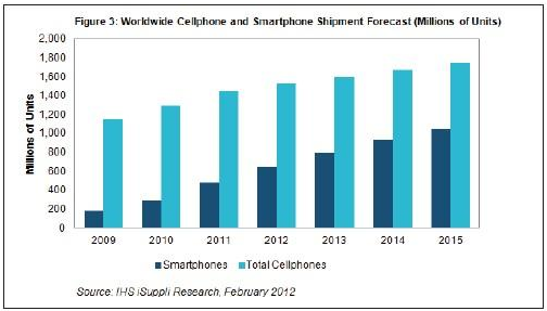 IHS公司的資深首席分析師Steve Mather 認為,2015年全球手機銷量將達17億部,其中10億部將是智能手機。這意味著2015年超過70億的人口中,14%將購買智能手機,如圖3所示。這個規模十分驚人,全球科技供應鏈紛紛調整方向,脫離電腦產業,投身于智能手機市場。時間框架:三年。