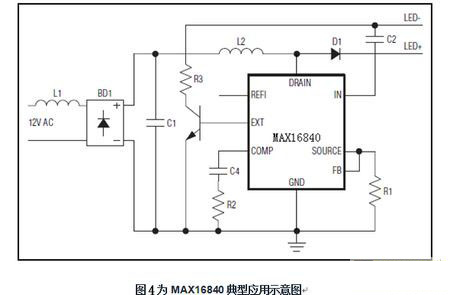 MAX16840具有的應(yīng)用特征是LED換代燈構(gòu)建技術(shù)的保證。MAX16840 集成MOSFET LED驅(qū)動(dòng)器,可用于MR16及其它12V交流輸入燈。它采用獨(dú)特的技術(shù)控制燈管的輸入電流,對(duì)輸入電流進(jìn)行整形,可使用大多數(shù)電子變壓器和調(diào)光器支持無閃爍工作,很好地解決了上述“問題的提出”之困擾。