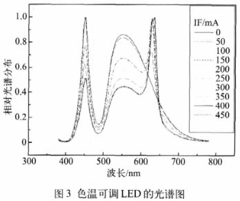 圖3為采用遠方HASS-2000高精度快速光譜輻射計測量得到的色溫可調LED 的光譜圖,從圖中可以看出,隨著紅光LED 電流的變化(從0 到450mA),LED 的相對光譜也會隨之變化,LED 的光譜有三個峰值,分別在450nm、550nm和628nm,暖色溫的發光效率大于68lm/W,冷色溫的發光效率達到87lm/W。