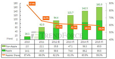 在蘋果的iPad 3即上市的的之際,2012年平板計算機市場的爭奪戰才算正式開打,根據產業研究機集邦科技(TrendForce)統合旗下WitsView(面板)、DRAMeXchange(NAND Flash)的研究數據,預估在2012年時全球平板計算機銷量將可望達到9,400萬臺,比起2011年的6,200萬臺,年成長達53.1%,在平板計算機的銷售量上,蘋果仍將維持前二年的強勢地位,其iPad將占市場六成以上,達5,900萬臺。