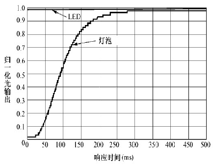 此外LED 的響應時間短,比普通燈泡響應時間一般要快200 ~ 300ms ( 見圖4)。應用于高位制動燈或轉向信號燈上,這點時間在高速公路上可以為司機贏得6. 7m 的制動距離( 按車速120km / h 計算) ,可以減少很多事故的發生。